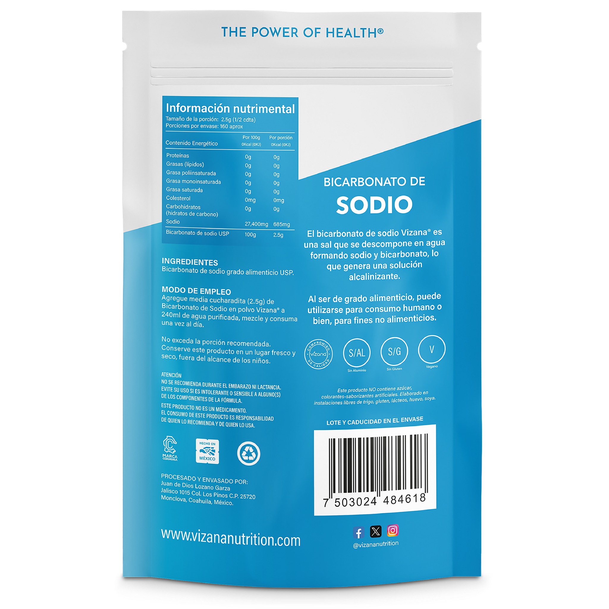 Alivia la acidez estomacal y la indigestión ácida con Bicarbonato de Sodio Puro Vizana. De grado alimenticio y 100% natural, solo necesitas una cucharadita al día para sentir sus beneficios. También puede usarse como exfoliante para la piel.