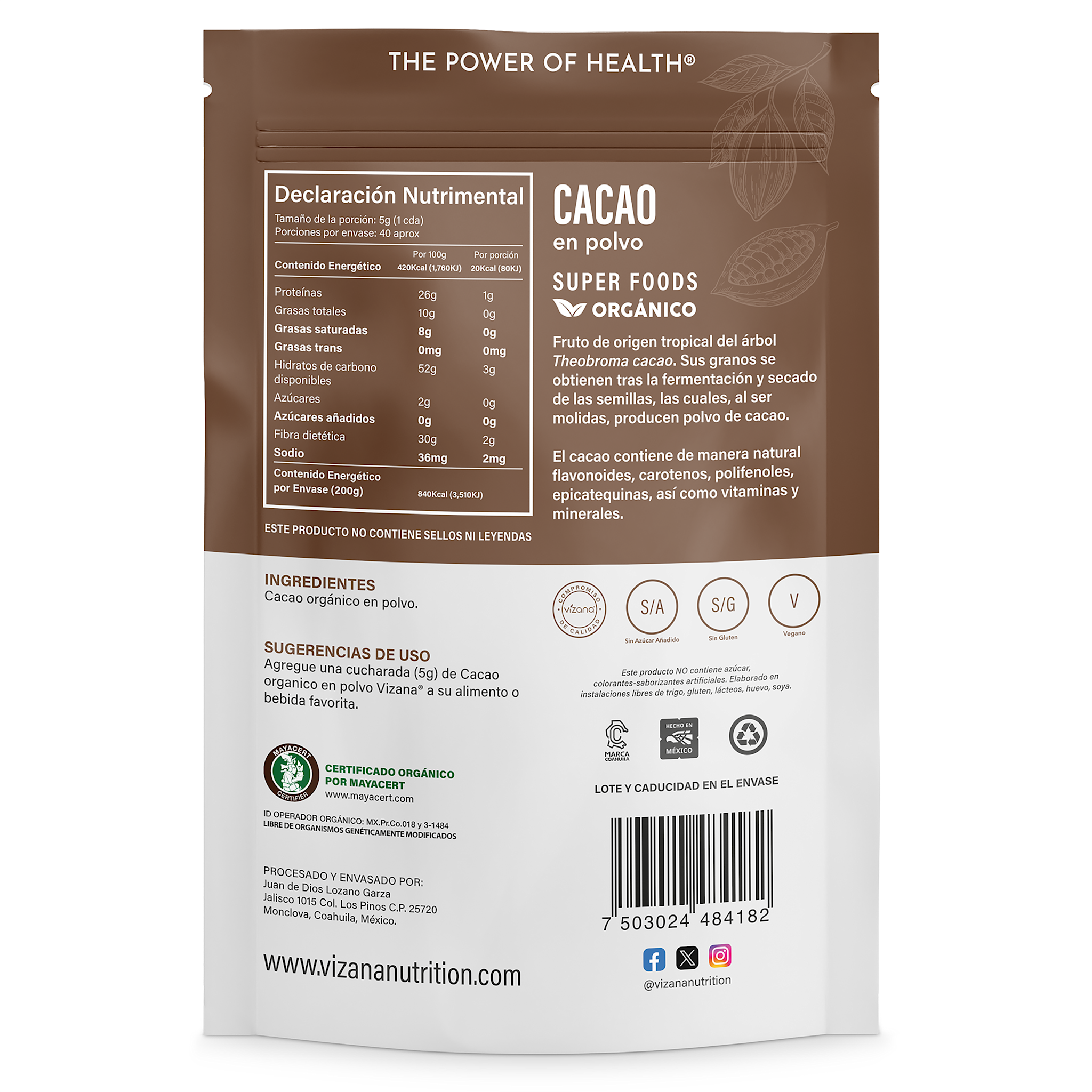 "Fruto de origen tropical de árbol "Theobroma caco"; sus granos de obtienen tras la fermentación y secado de sus semillas. Al no ser sometido a ningún proceso término preserva sus nutrientes; contiene flavonoides, polifenoles, epicatequinas, hierro, magnesio y fibra dietética entre sus principales nutrientes, considerando como un alimento funcional.