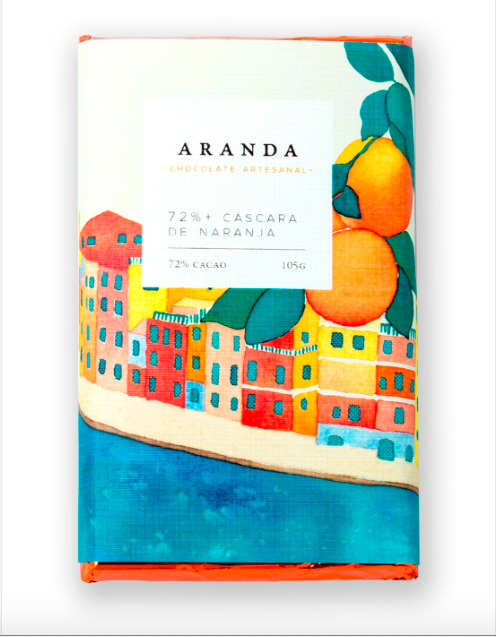Chocolate amargo 72% cacao con trozos de cáscara de naranja cristalizada. Hecho a mano, vegano, libre de lácteos, gluten y conservantes. 105g de un sabor profundo y cítrico.