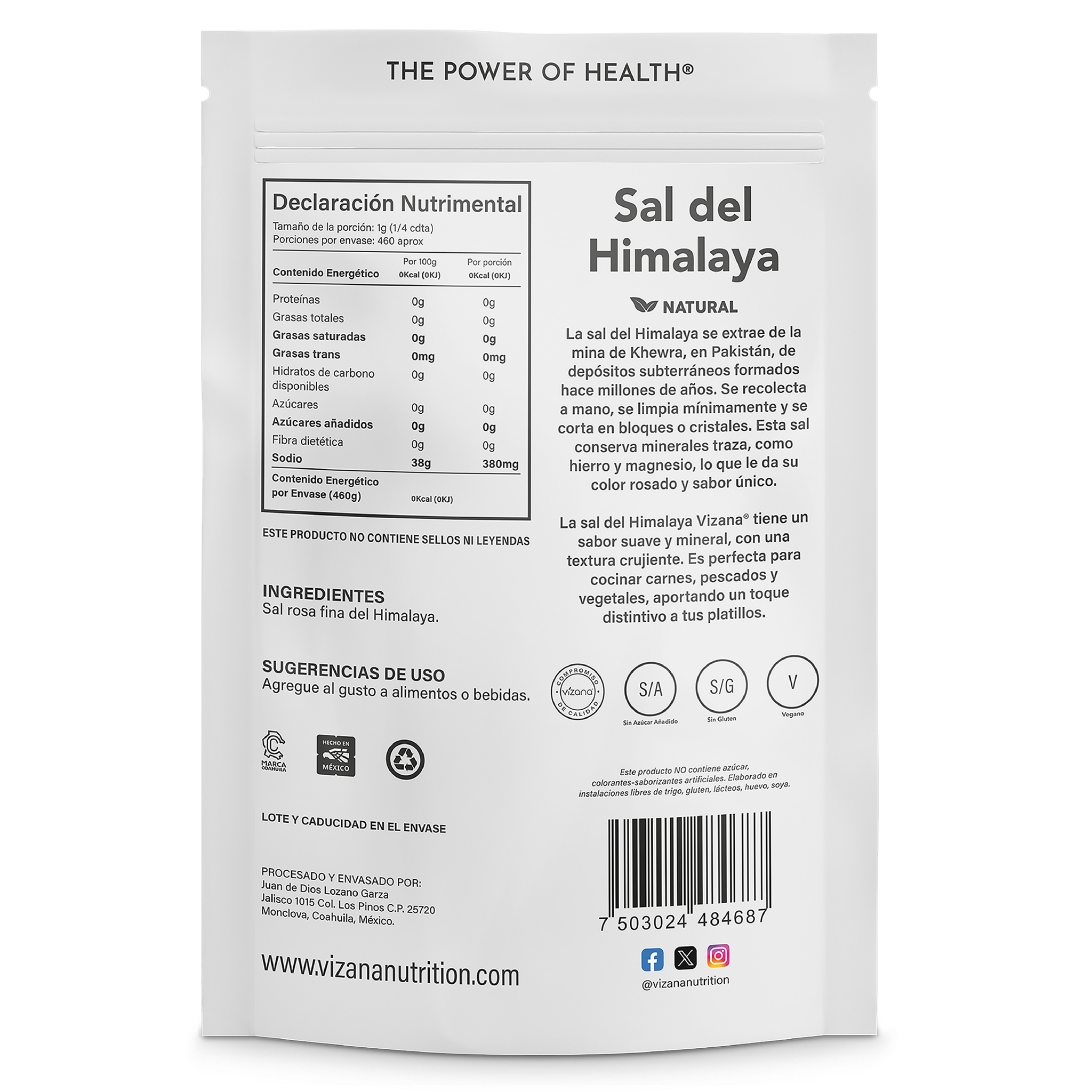 La sal del Himalaya VIzana es extraída a mano. Contiene más de 84 minerales y oligoelementos incluyendo calcio, magnesio, potasio, cobre y hierro.