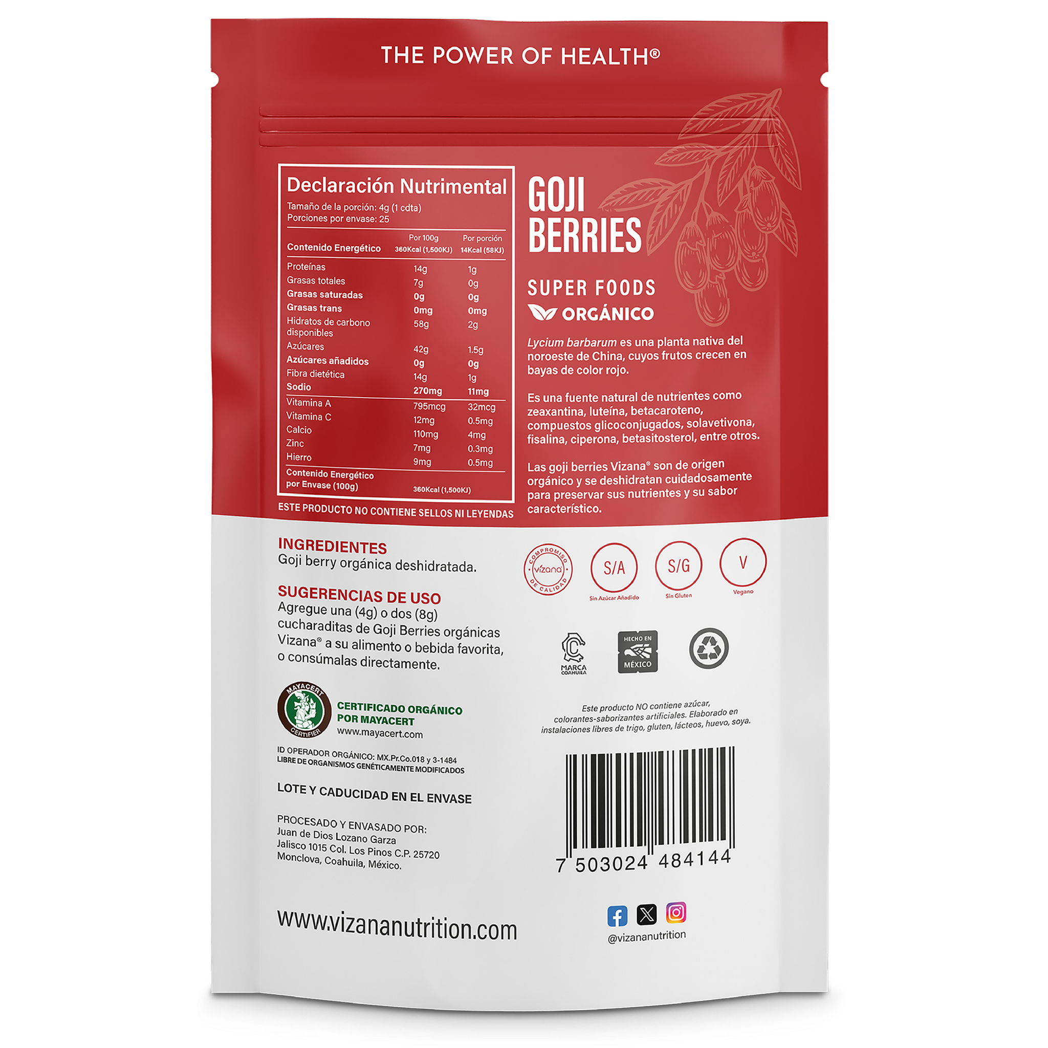 Goji Berries Orgánico Sin gluten, Vegano. Lycium barbarum es una planta nativa de noroeste de china cuyo fruto crece en baya de color rojo. Es una planta nativa del noroeste de China cuyo fruto crece en baya de color rojo. Contiene una gran cantidad de antioxidantes, destacando carotenoides (betacaroteno, zeaxantina, liteína, licopeno y criptoaxantina) vitaminas y minerales. Fuente natural de fibra y proteína.