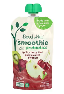 El Beech-Nut Yogurt Smoothie Pouch es un puré diseñado para niños pequeños (etapa 4, a partir de 12 meses) que combina fruta real con yogur, ideal para un desayuno o snack nutritivo sobre la marcha.